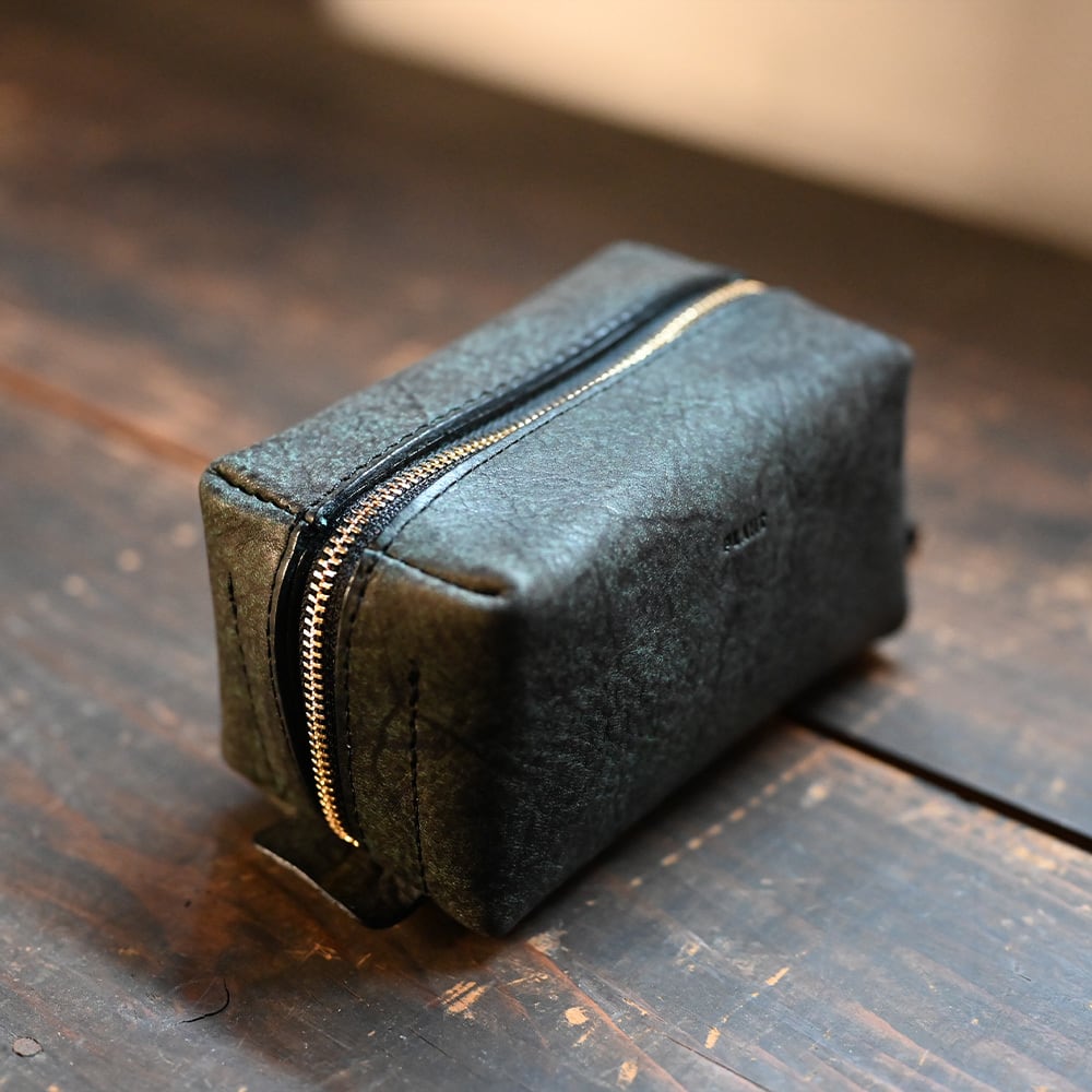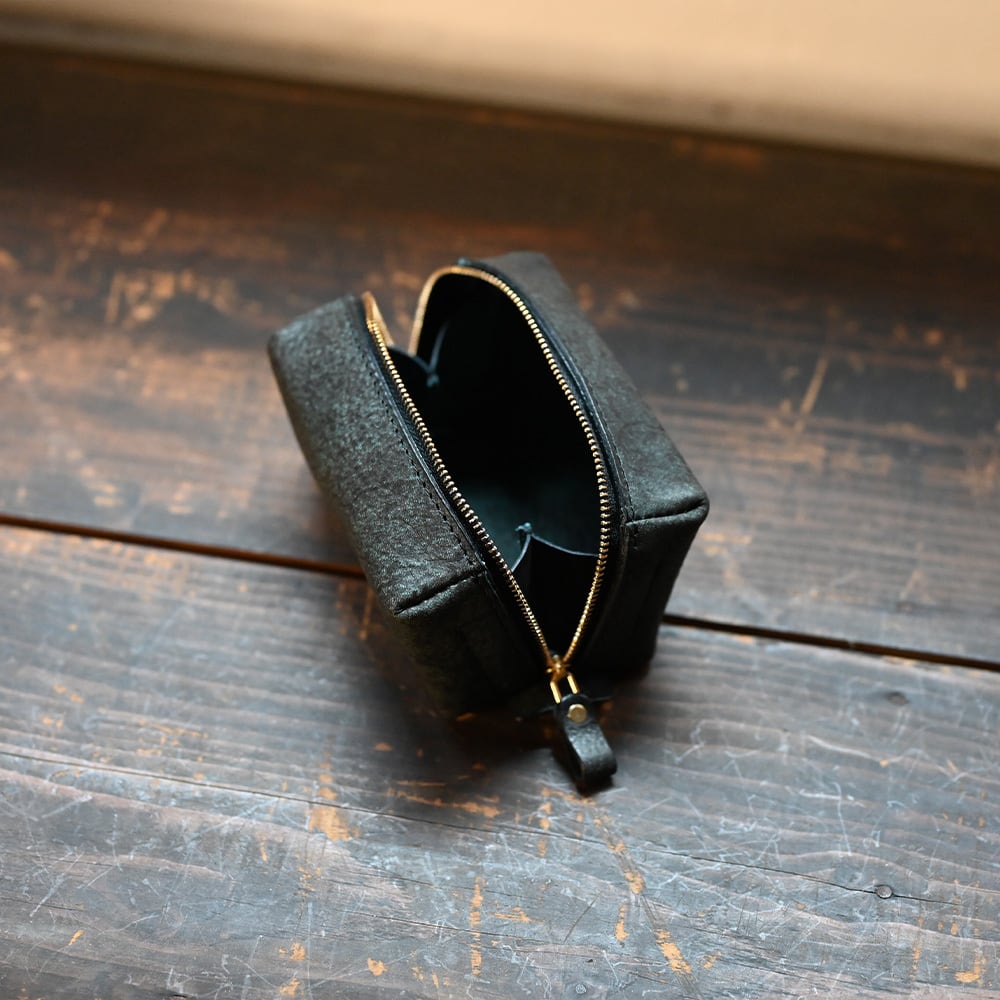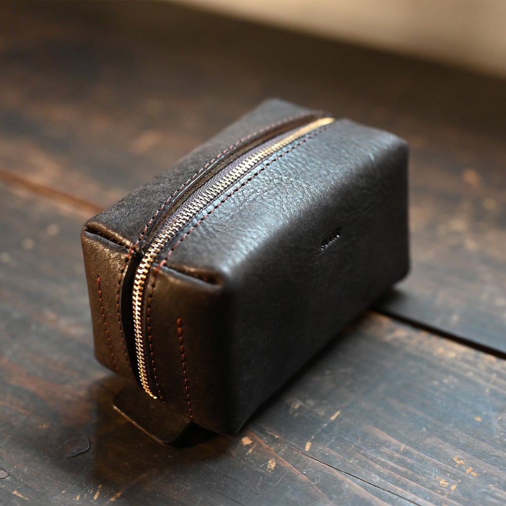 フランス産の雌牛のショルダー部分を下染めしたものを、濃い茶染料のピット槽に浸けて二度染め加工を施しています。そのため、鮮やかな色彩の上に黒雲が被さったような奥行きのある配色となっており、人の意図ではない水の力によって偶発的に配された色模様は歴史を重ねた古色・アンティークの風情を纏っています。