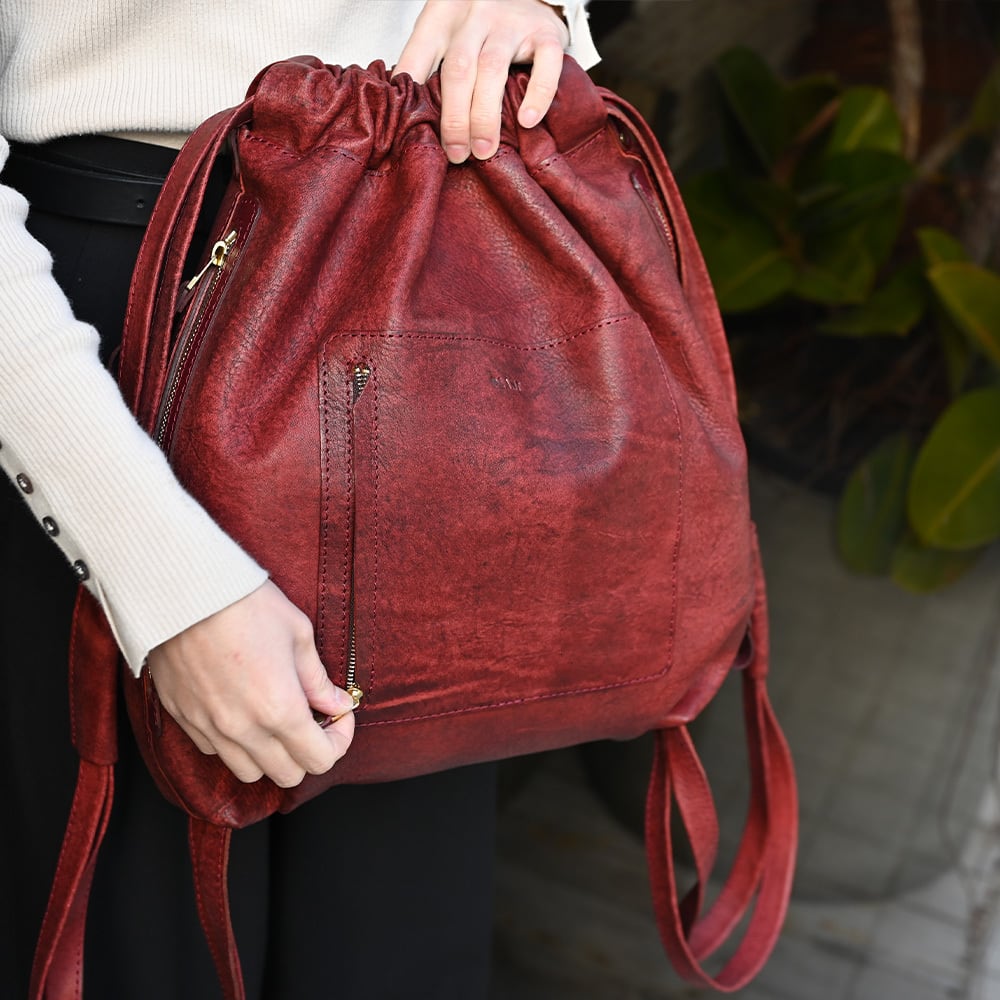 丸みを帯びた可愛らしいフォルムの巾着リュック。