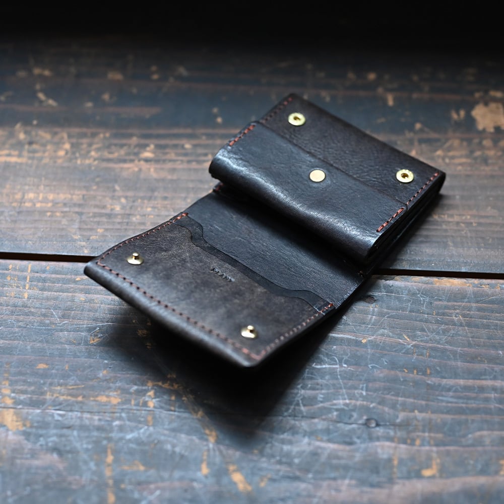 表面に装飾のない自然な革の表情を楽しめる二つ折り財布。