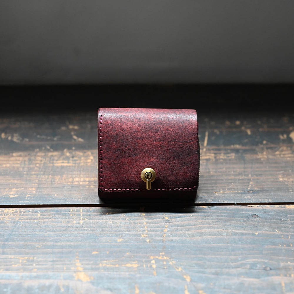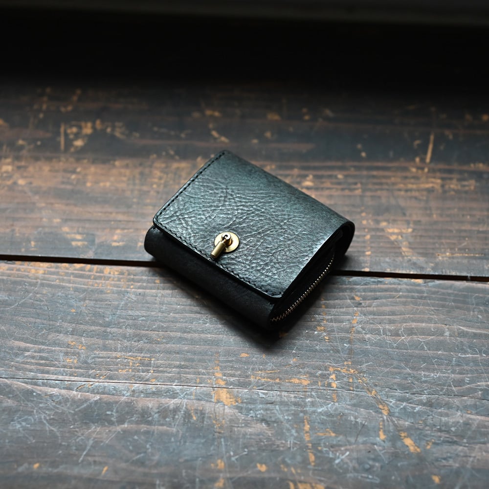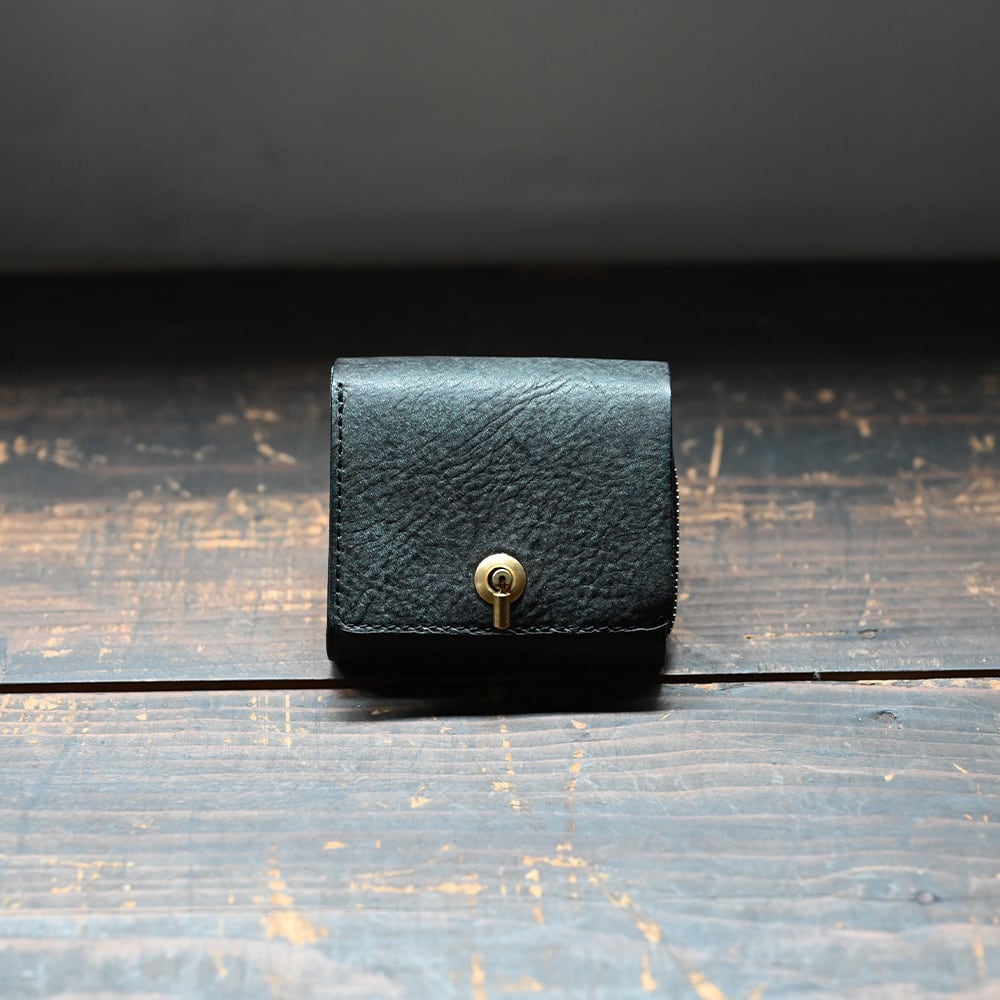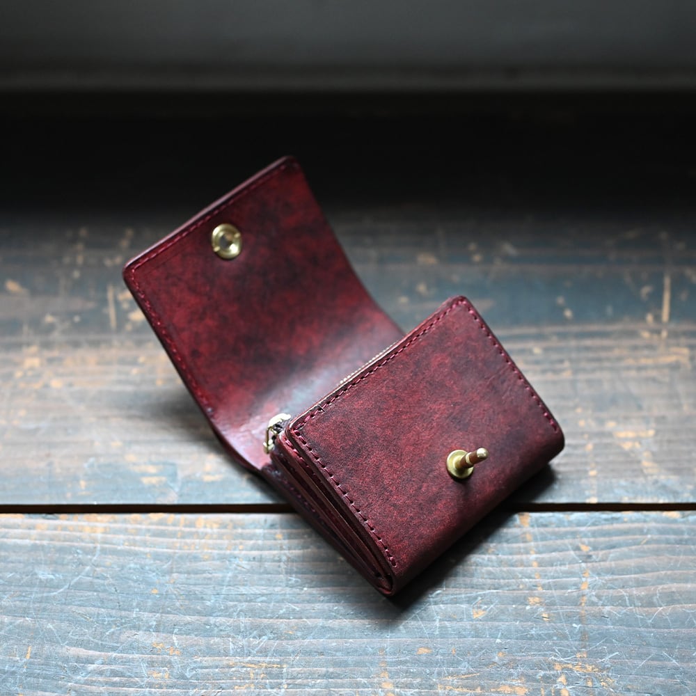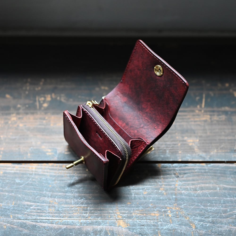 ぷっくりしたフォルムに真鍮製のハトメ起こし金具が特徴的な二つ折り財布