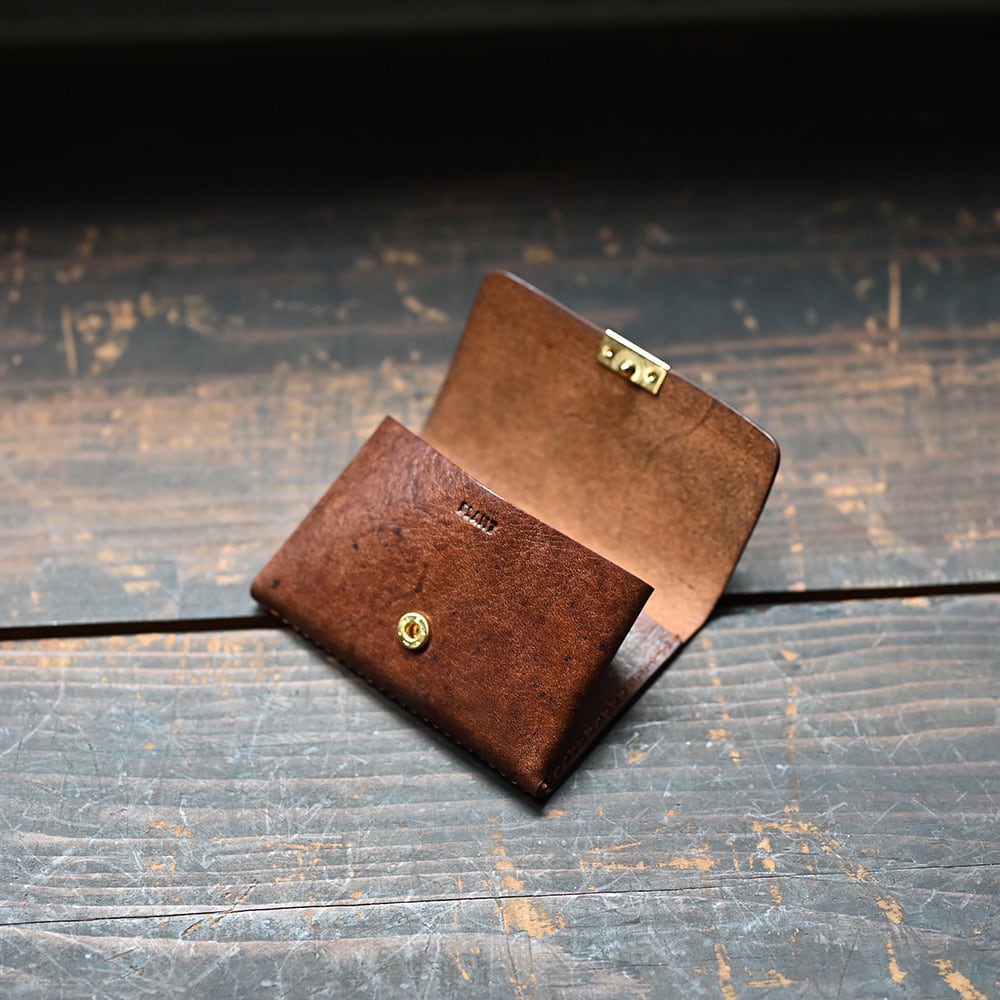 蝶が羽ばたく動作からインスピレーションを受けたヘリ留めホックの名刺入れ。