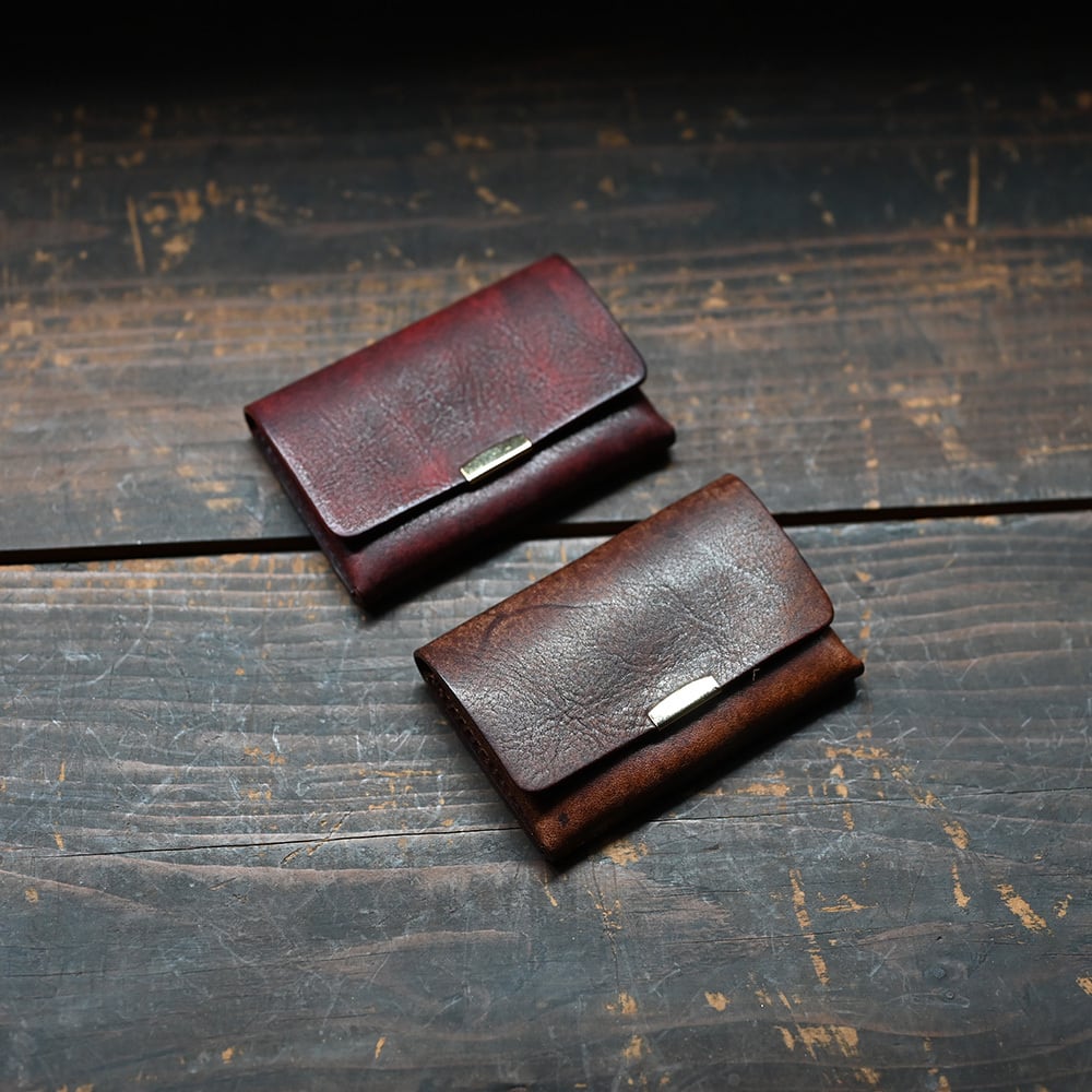 フランス産の雌牛のショルダー部分を下染めしたものを、濃い茶染料のピット槽に浸けて二度染め加工を施しています。そのため、鮮やかな色彩の上に黒雲が被さったような奥行きのある配色となっており、人の意図ではない水の力によって偶発的に配された色模様は歴史を重ねた古色・アンティークの風情を纏っています。