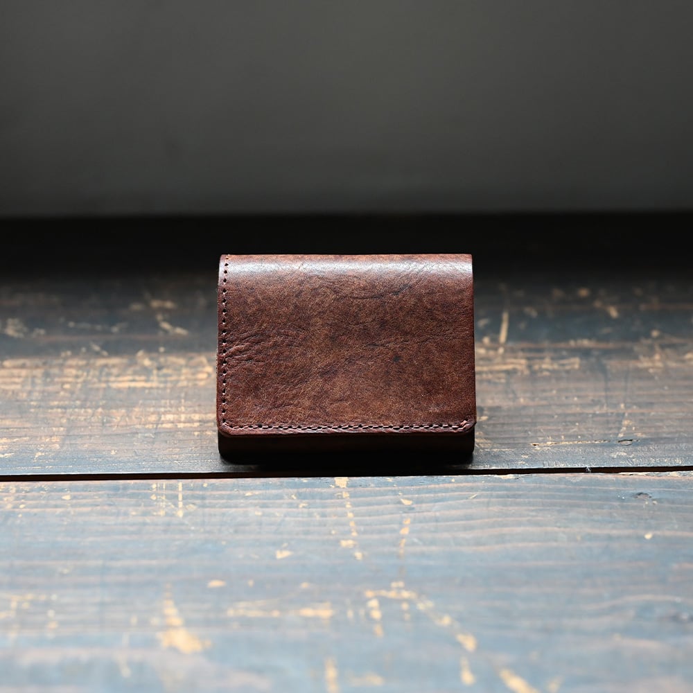フランス産の雌牛のショルダー部分を下染めしたものを、濃い茶染料のピット槽に浸けて二度染め加工を施しています。そのため、鮮やかな色彩の上に黒雲が被さったような奥行きのある配色となっており、人の意図ではない水の力によって偶発的に配された色模様は歴史を重ねた古色・アンティークの風情を纏っています。