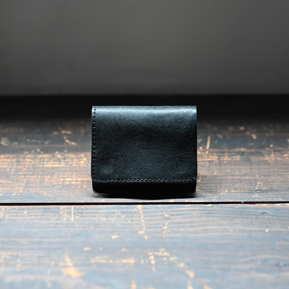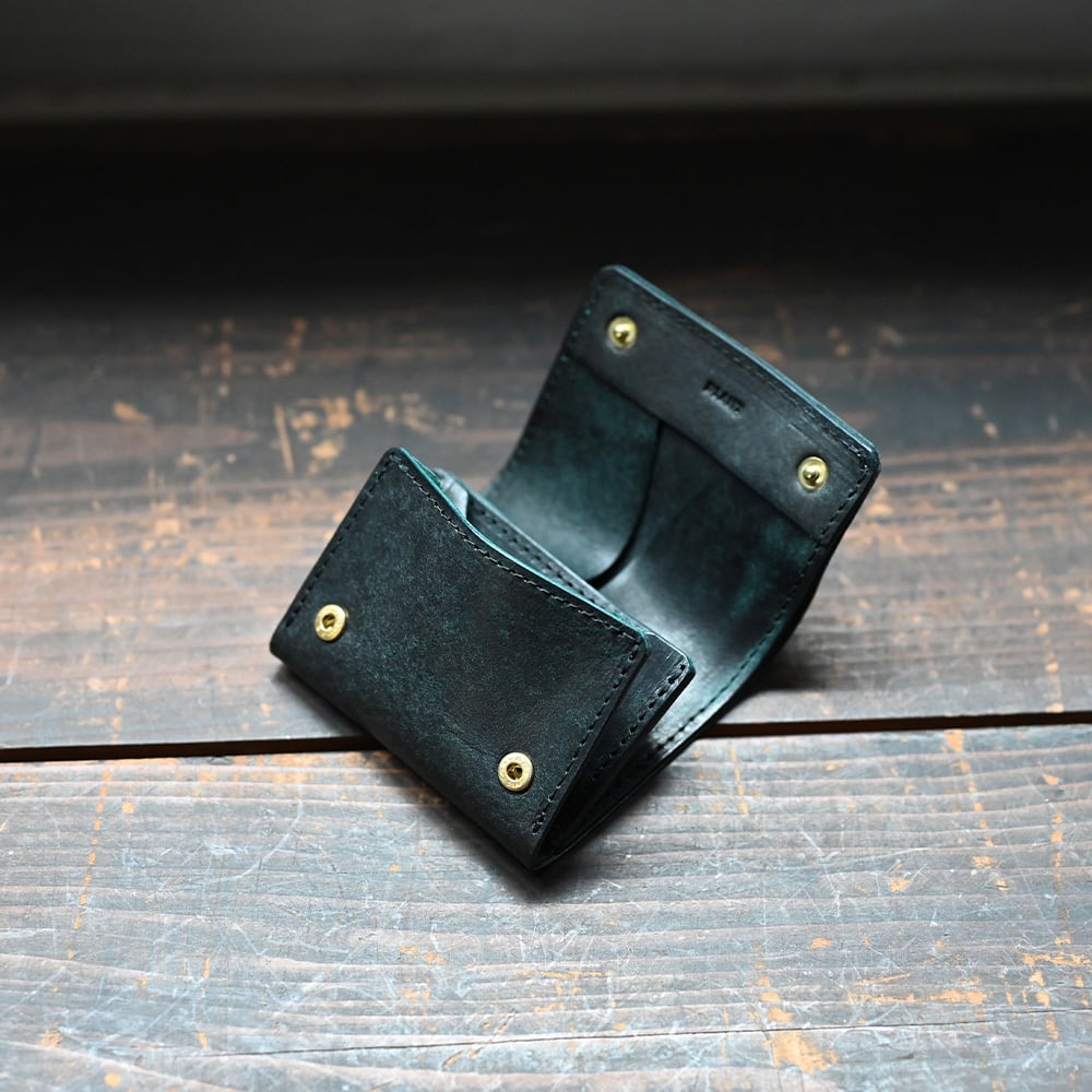 がばっと大きく見開き革の風合いを楽しめるポケットサイズの二つ折り財布です。