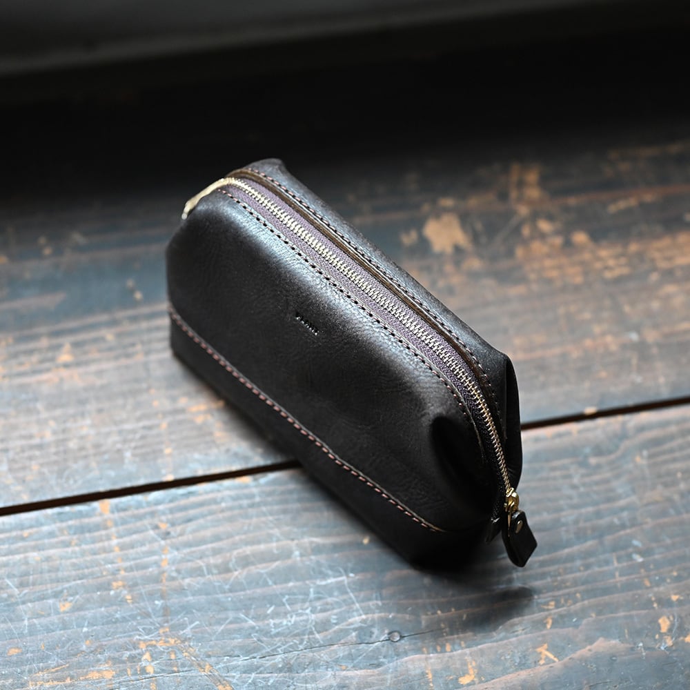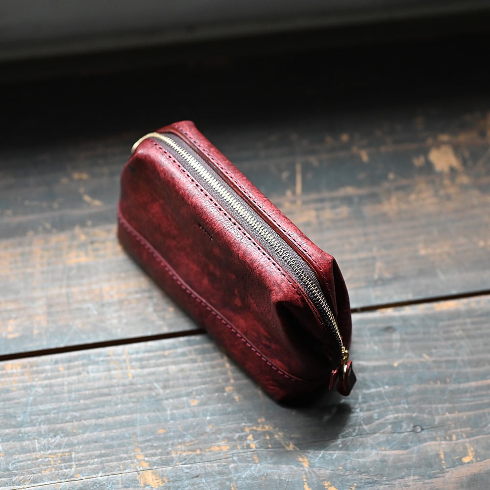 フランス産の雌牛のショルダー部分を下染めしたものを、濃い茶染料のピット槽に浸けて二度染め加工を施しています。そのため、鮮やかな色彩の上に黒雲が被さったような奥行きのある配色となっており、人の意図ではない水の力によって偶発的に配された色模様は歴史を重ねた古色・アンティークの風情を纏っています。