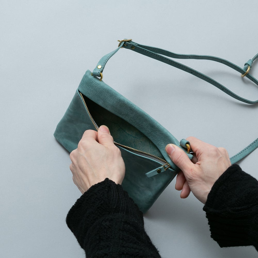 隠しマチの構造により、フラットな形状から内容物に応じて最大3.5cmほどの底マチに可変します。お財布やキーケースなどの厚みのあるものを収納しても馴染みがよく、違和感なくお使いいただけます。