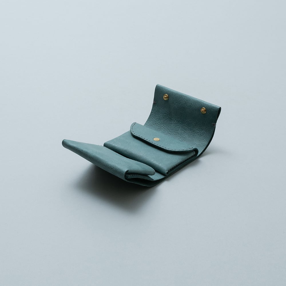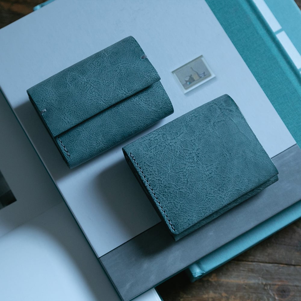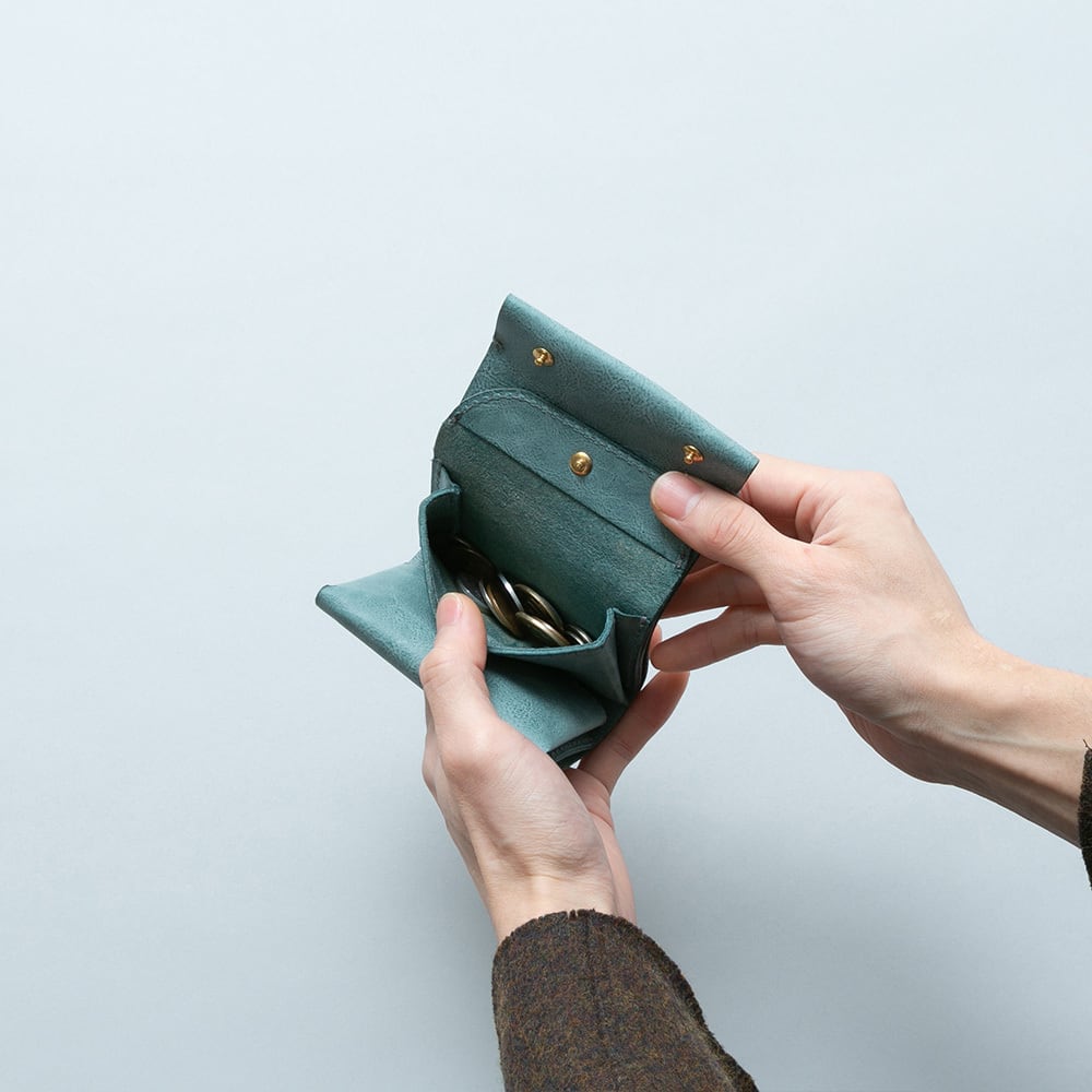 隠しホック留め仕様のためプレーンな見た目をしていますが、かぶせのふっくらした折り返しや一本ステッチが優しい印象を与える折りたたみ財布となっています。