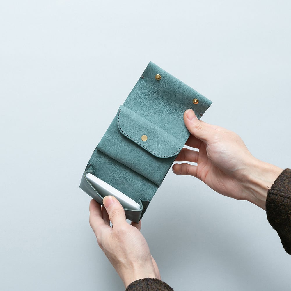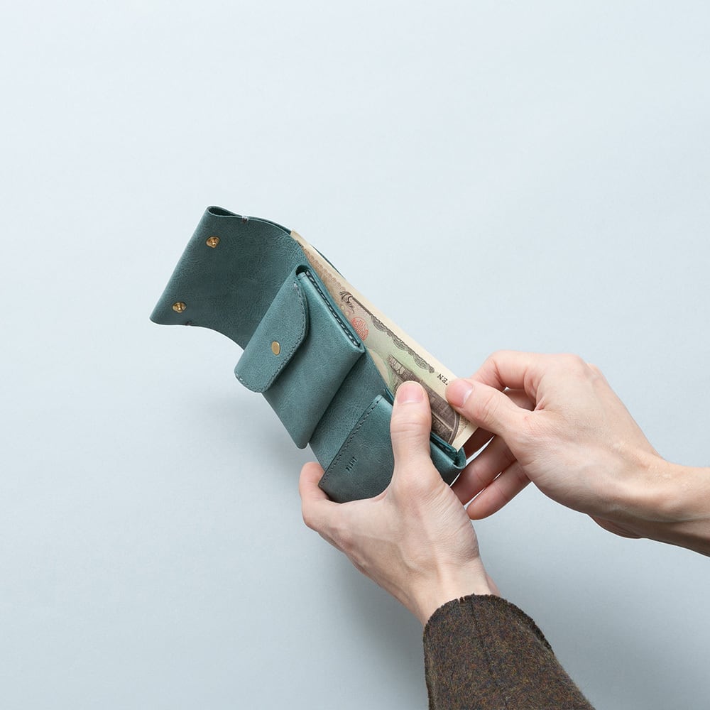 一枚革でくるっと全体を巻き込んだような袋状の札入れは一万円札よりもさらに余裕を持った間口を確保することで開きやすく、長めのレシートや商品券なども出し入れしやすい構造となっています。