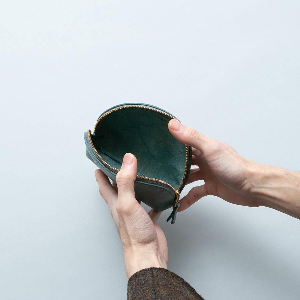 ファスナーの裏側に補強の革を縫い込む事で型崩れを抑え、スムーズに開閉するように仕上げています。またファスナーを深めに設定することで大きく開口するため、見通しが良く収納物が取り出しやすいことも特徴の一つです。