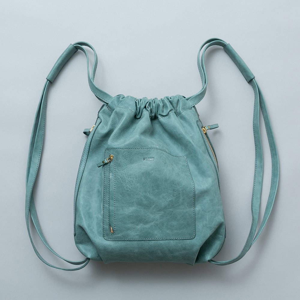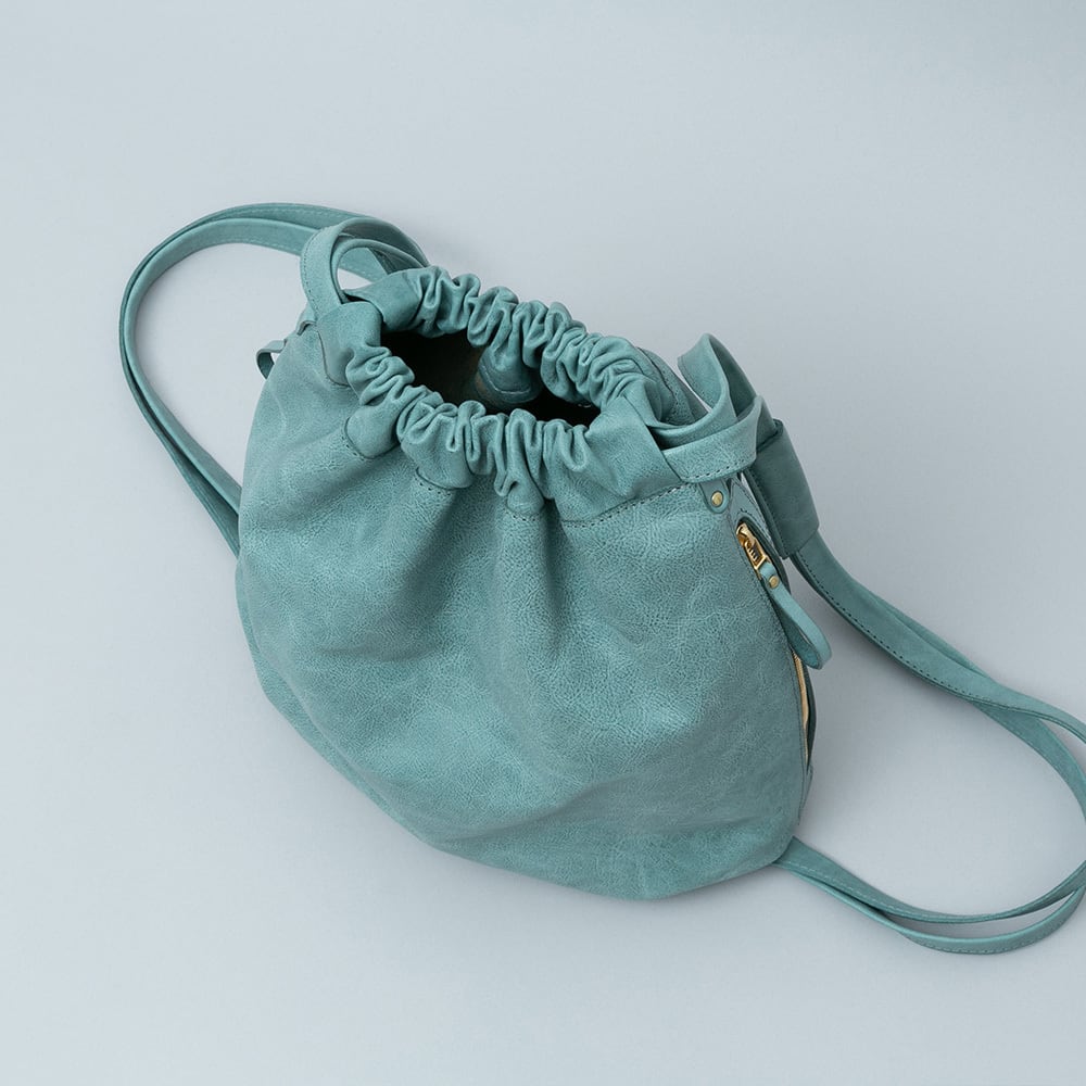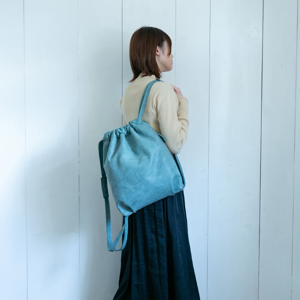 丸みを帯びた可愛らしいフォルムの巾着リュック。