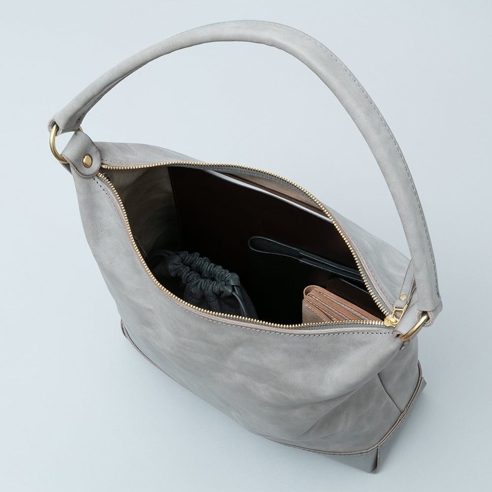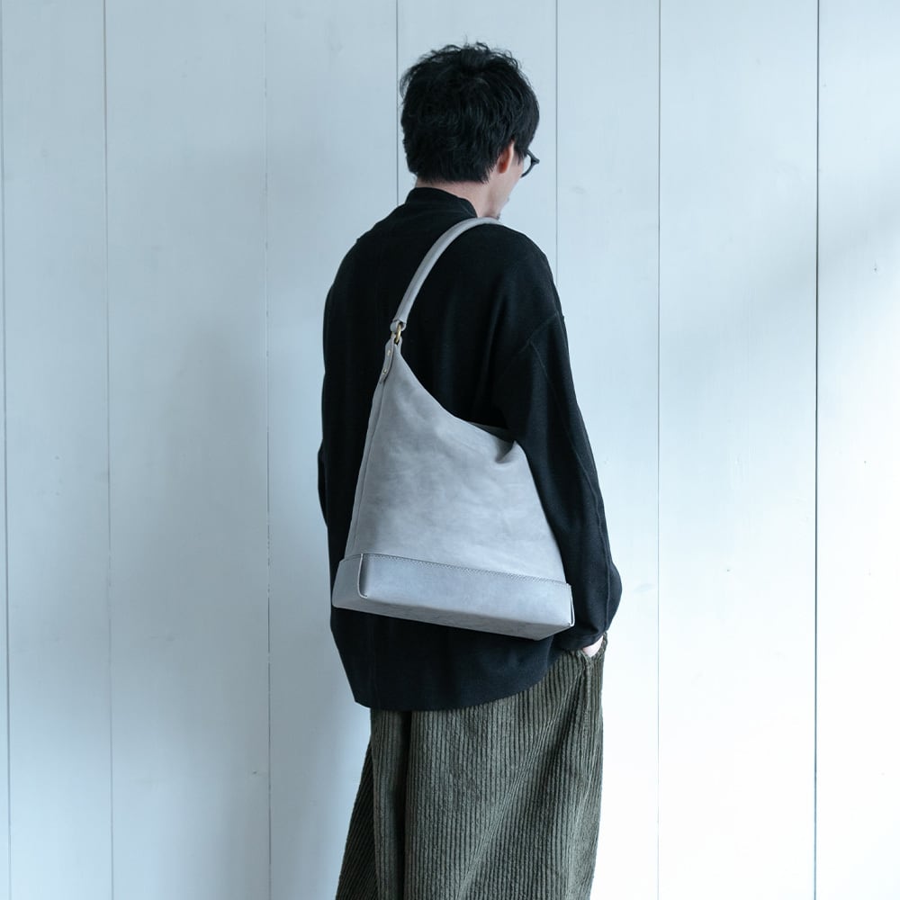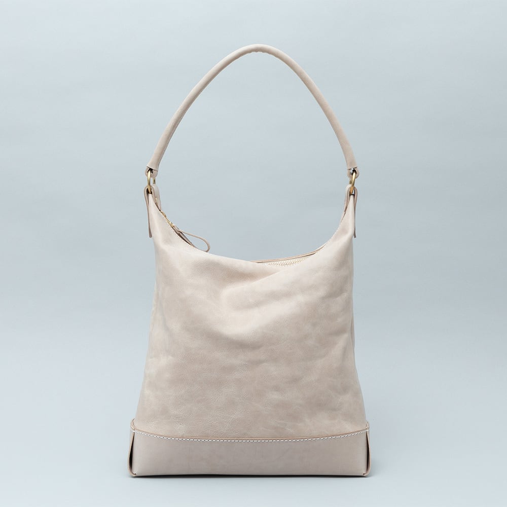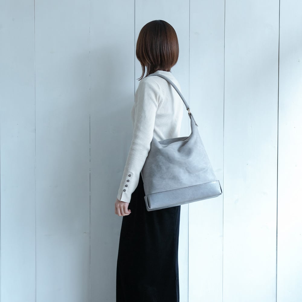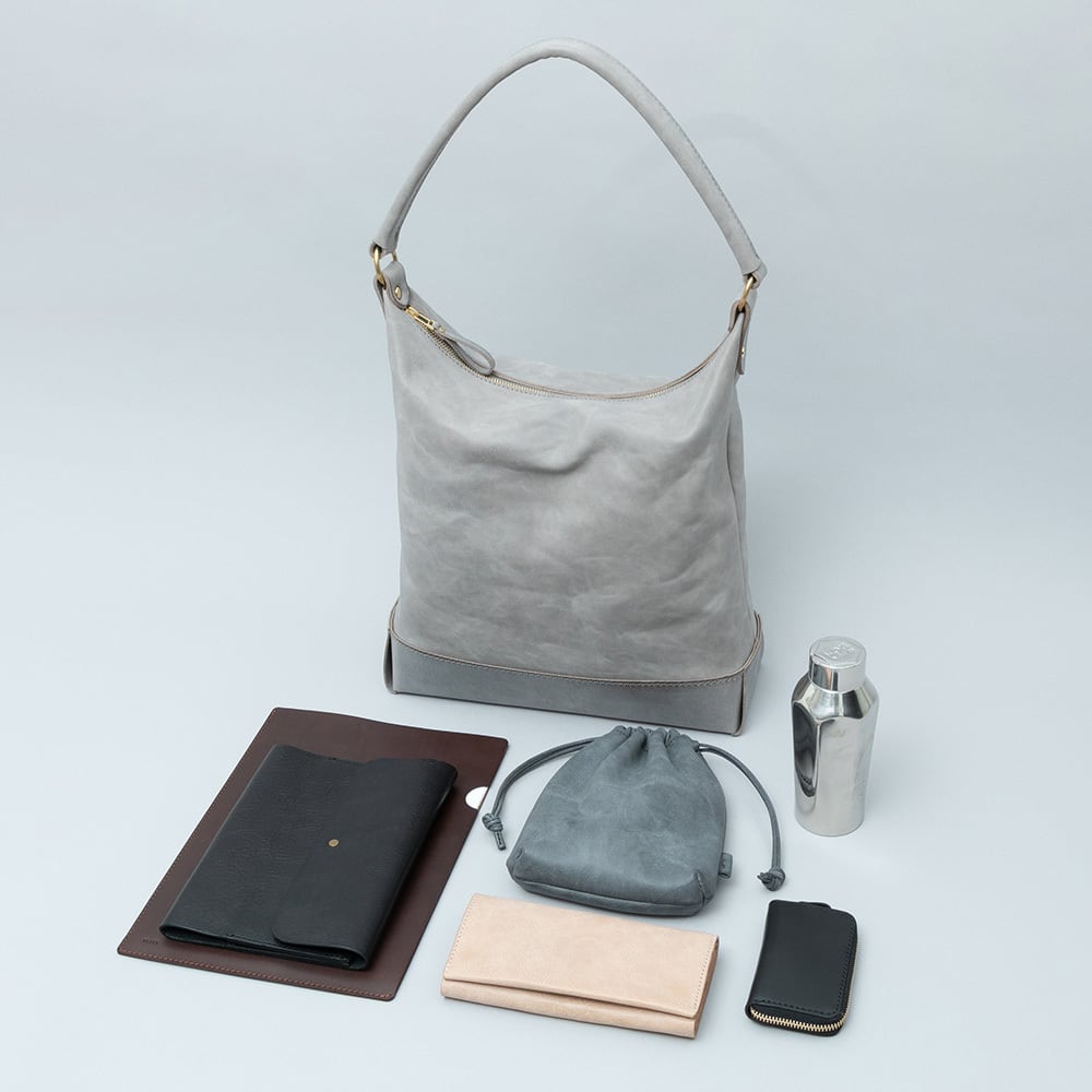 【Arco tote bag / TT-340】 Leather : SIBILLA LISCIO × SIBILLA BOX color : Ivory / Graphite / Smoke black size : W330mm / H330mm (取手含まず)- 300mm(取手高) / D120mm weight : 0.8kg 本体からショルダーストラップにかけて柔らかな円弧を描いたトートバッグ。 シビラボックスの柔軟性を活かした沈み込むような落ち感のあるフォルムが印象的な本体。底部分にはスムースレザーのシビラリスシオで切り返しをしているため、革質のコントラストを楽しみつつも床に置いた時にしっかりと自立するように仕立てています。 本体収納部はA4規格に対応しており、内部にはA5ノートの入る差し込みポケットを付属しています。背面部にはファスナーポケットを付けているため、キーケースやスマートフォンなどよく取り出すものの収納におすすめです。 写真ではフラップノートカバーL(NC-2029-L)、A4レザーファイル(NC-1052)、ドローストリングポーチM(PO-3037-M)、スクエアウォレットL(WA-3005-L)、ラウンドジップキーケース(KH-1028)、タンブラーを収納しています。 カジュアルからフォーマルまで幅広く使用できるすっきりとしたワンハンドルトートバッグです。 【受注制作商品】 こちらの商品はご注文を頂いてから製作致します。お手元に届くまで4-5週間の納期を頂いておりますので予めご了承ください。 在庫がある場合は3営業日以内に発送致します。在庫の有無は事前に問い合わせることも可能ですのでお急ぎの場合はご連絡下さい。