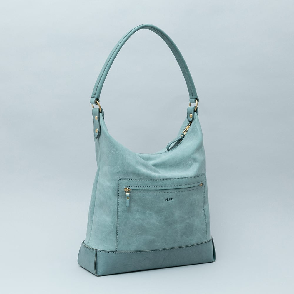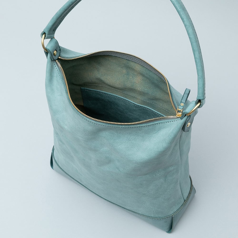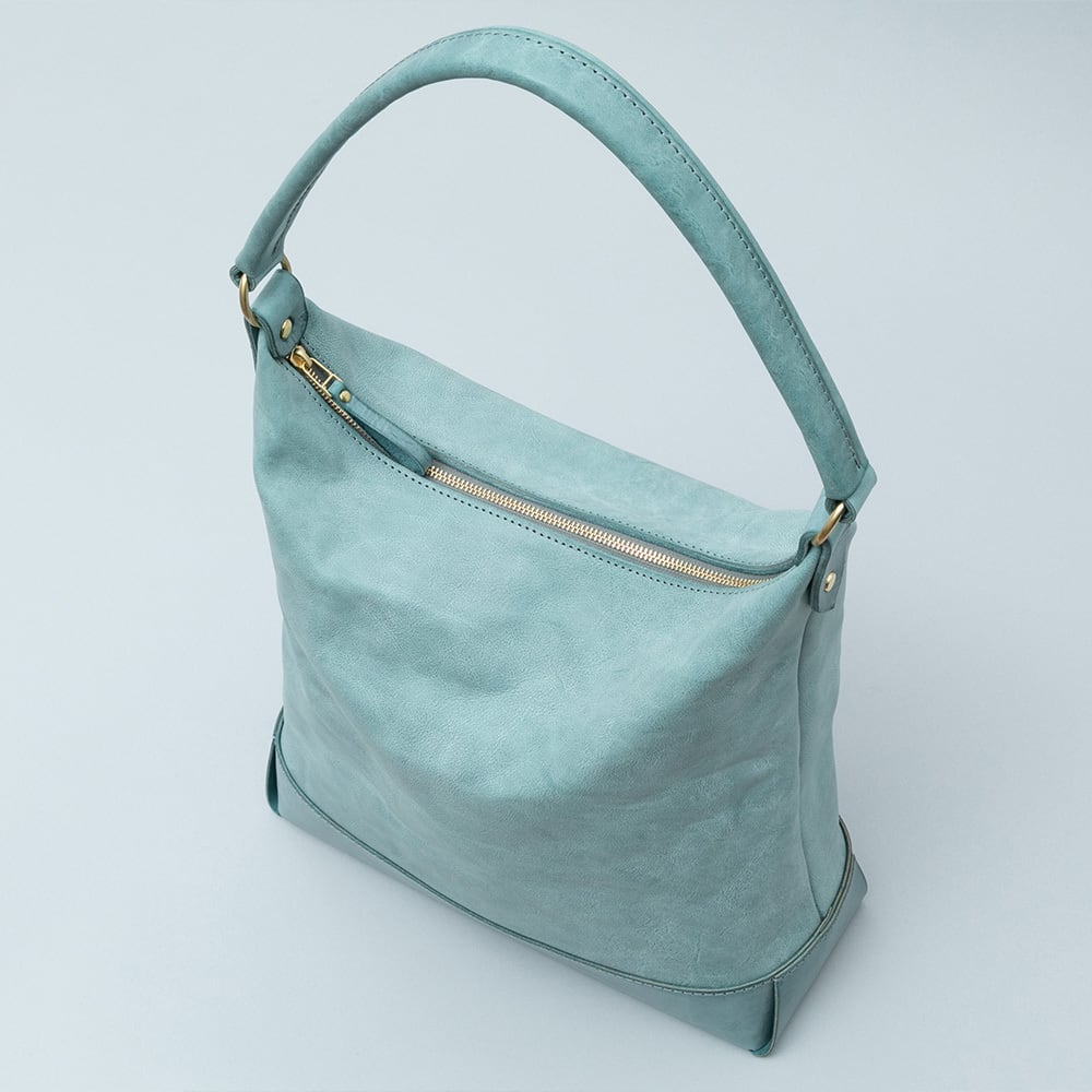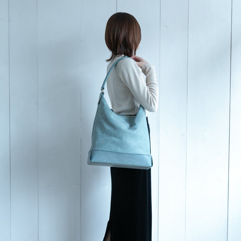 本体からショルダーストラップにかけて柔らかな円弧を描いたトートバッグ。