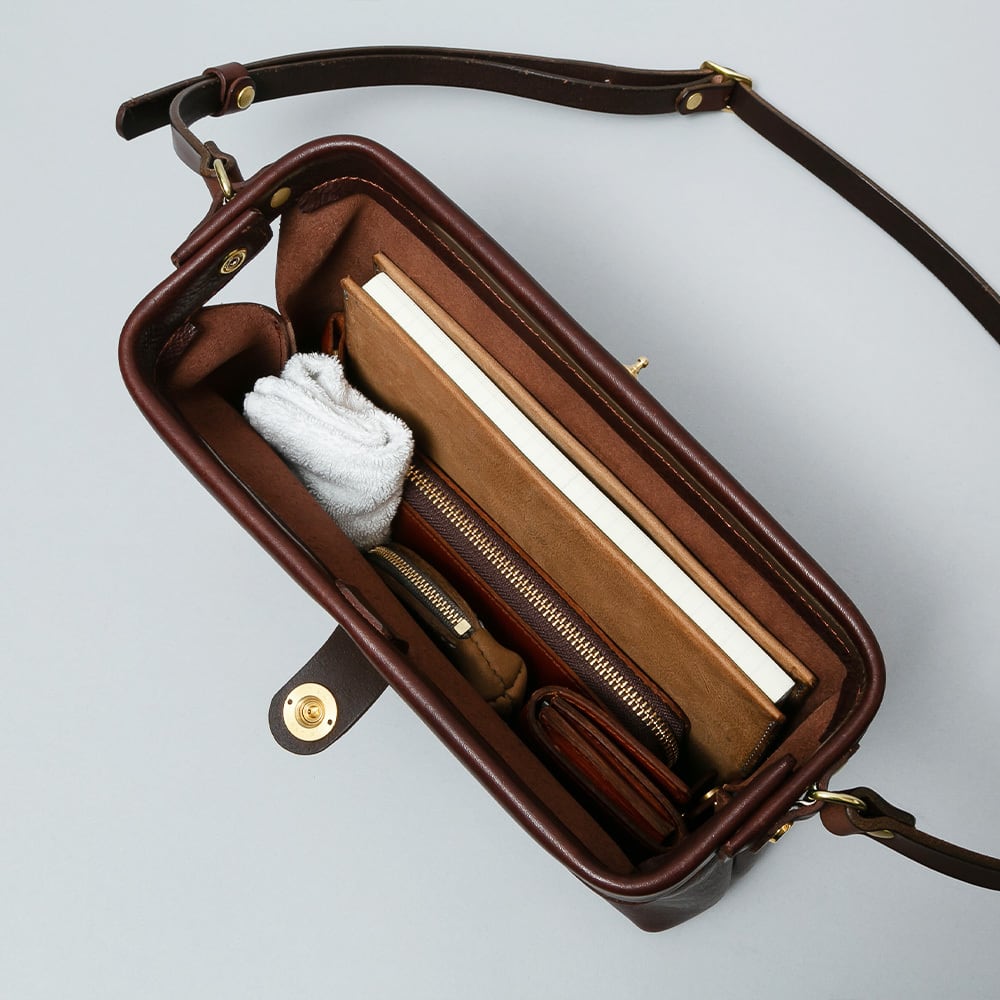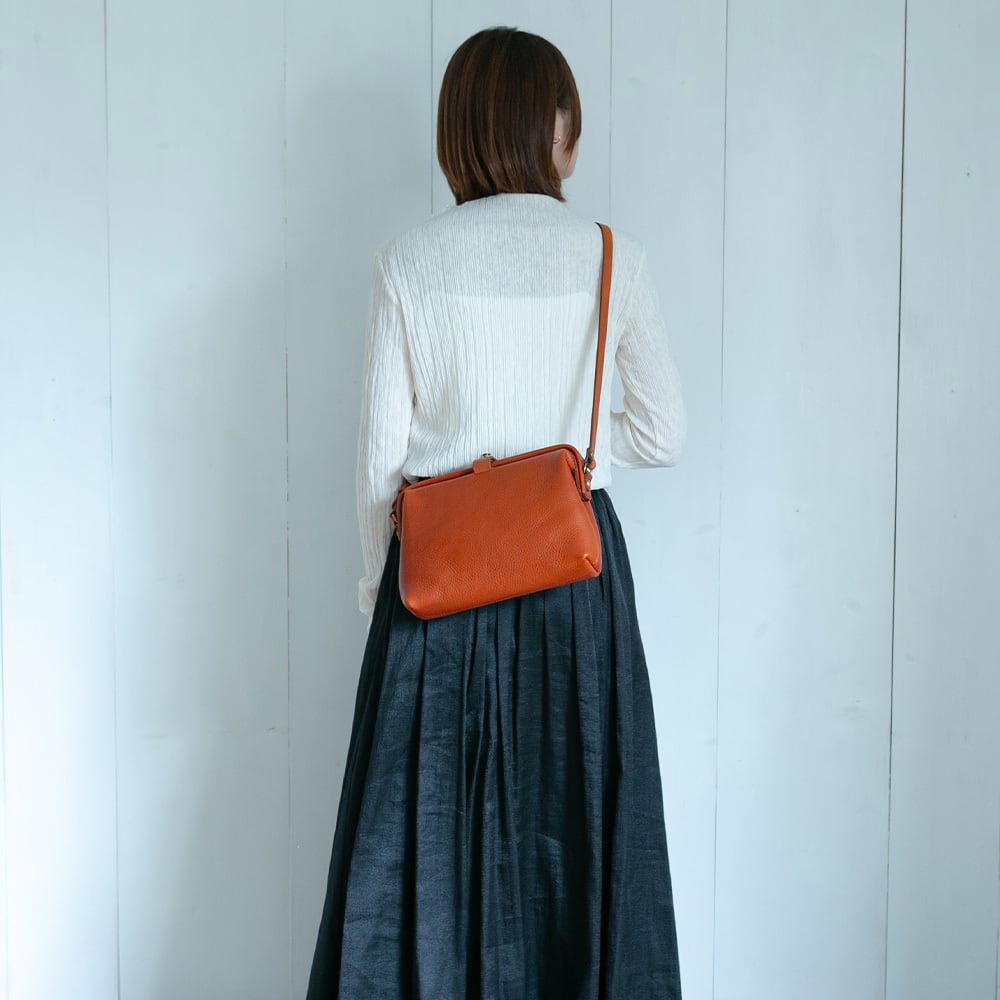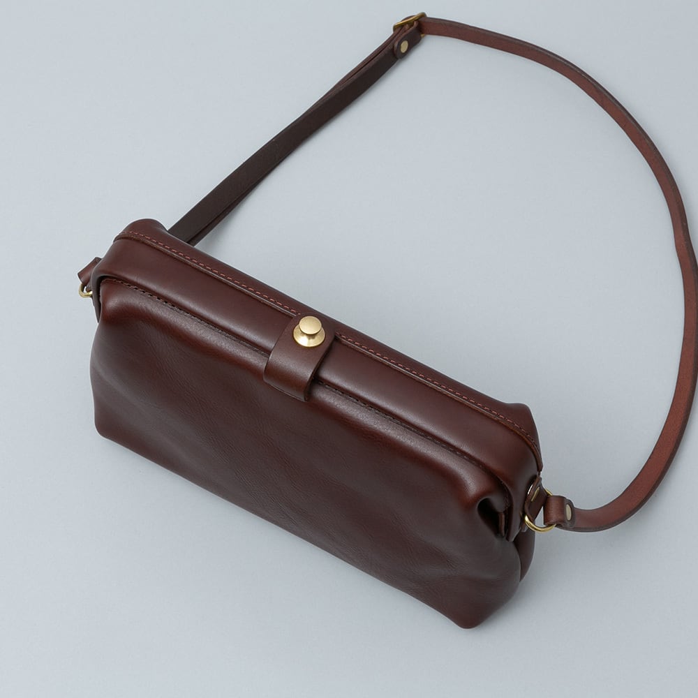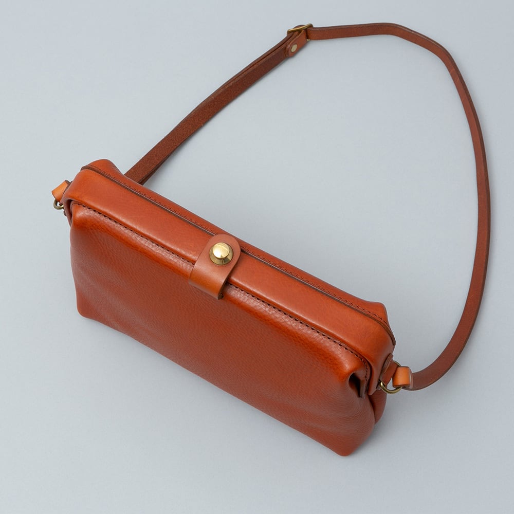 【Swallow shoulder M / SH-215-M】 Leather : NEBRASKA color : Brown / Dark brown / Black size : W270mm / H190mm / D60mm weight : 0.6kg すっきりとした盤面にドイツホック留めがワンポイントになっている口枠式ショルダーバッグ。 ネブラスカの肉厚で柔らかな質感が感じられる、ふっくらとしたフォルムが特徴です。 鞄上部に取り付けられたドイツホックによりワンタッチで大きく開き、背負った時に上部から内部全体を見渡せる視界の良さを兼ね備えています。 写真ではA5ブックカバー、スクリューキーケース(KH-1022)、ダブルジップウォレット(WA-1001)、サークルポーチS(PO-3018-S)、ビジネスカードケース(CC-1008)、ハンカチを収納しています。 ミニマムな見た目の中にどこかクラシックな雰囲気を持ったA5サイズのショルダーバッグ。ペットボトルや小型の折り畳み傘など、もしもの時に必要な持ち物も気軽に持ち運ぶことが可能です。 【ショルダー】 Leather : TENDER 幅15mm、長さ100cm-120cm 穴数5発、6.5cmピッチ 革の性質上、伸びがあるため表記サイズと誤差が生じる場合があります。 こちらの製品はショルダー一体型となっていますので着脱は出来ません。 【受注制作商品】 こちらの商品はご注文を頂いてから製作致します。お手元に届くまで4-5週間の納期を頂いておりますので予めご了承ください。 在庫がある場合は3営業日以内に発送致します。在庫の有無は事前に問い合わせることも可能ですのでお急ぎの場合はご連絡下さい。