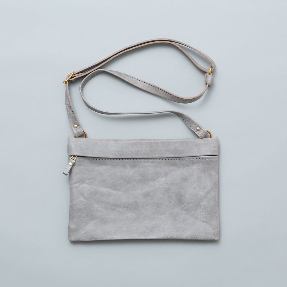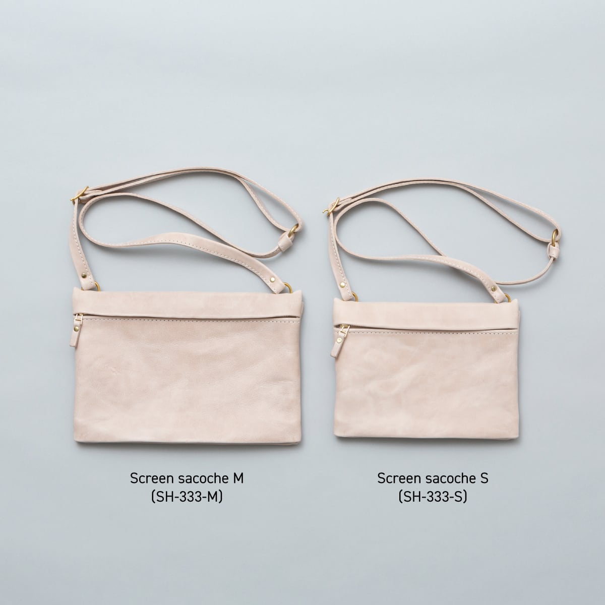 【Screen sacoche M / SH-333-M】 Leather : SIBILLA BOX color : Ivory / Graphite / Smoke black size : W260mm / H180mm / D15-35mm weight : 0.25kg 縫製を最小限に抑えたミニマルな見た目が特徴の軽やかなサコッシュ。 隠しマチの構造により、フラットな形状から内容物に応じて最大3.5cmほどの底マチに可変します。お財布やキーケースなどの厚みのあるものを収納しても馴染みがよく、違和感なくお使いいただけます。 Mサイズは横幅20cmほどの長財布が収納できるよう設計しており、背面にはスマホやカードケースなどが入る盤面サイズの差し込みポケットを取り付けています。 セパレート式のショルダーは革の折り返しにより肩当たりも優しく、背負った際に身体の動きに沿って稼働しやすいものとなっています。繋ぎ部分の丸カンにはイヤホンケースやキャップ帽などを引っ掛けてご活用いただけます。 自転車に乗る時や旅行の際のサブバッグとして、イベント時に最小限の荷物で行動する時など幅広くお使いいただけます。また、貴重品類をまとめておくバッグインバッグとしての用途にもおすすめです。 写真ではロールキーケース(KH-2036)、バレーナウォレットL(WA-2031-L)、プレーンブックカバーS(NC-3011-S)、スマートフォンを収納しています。 【ショルダー】 Leather : SIBILLA BOX 幅15mm、長さ95cm-120cm 穴数8発、6.5cmピッチ 革の性質上、伸びがあるため表記サイズと誤差が生じる場合があります。 こちらの製品はショルダー一体型となっていますので着脱は出来ません。 【受注制作商品】 こちらの商品はご注文を頂いてから製作致します。お手元に届くまで4-5週間の納期を頂いておりますので予めご了承ください。 在庫がある場合は3営業日以内に発送致します。在庫の有無は事前に問い合わせることも可能ですのでお急ぎの場合はご連絡下さい。