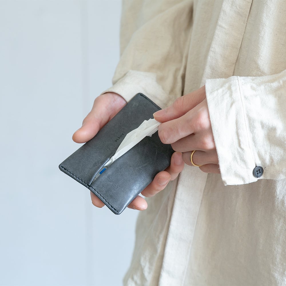 【Pocket tissues case / PO-3043】 Leather : SIBILLA BOX color : Ivory / Graphite / Smoke black size : W130mm / H90mm / D3.5mm 革の手触りを楽しめるシンプルなポケットティッシュケース。 凹凸のないフラットなデザインなのでちょっとした隙間にも入れやすく持ち運びに便利な構造。 折り返された取り出し口はステッチレスのため引っ掛かりを感じず、スマートにティッシュを引き出すことができます。また、カバンの中にしまっていても見つけやすく、中身もくしゃくしゃにならずに最後まで使いきれることもポイントです。 使い初めは収納時にきつさを感じますが、使い込むほど革が柔らかくなり内容量に応じて馴染んでいきます。 一見するとポケットティッシュケースには見えないミニマムな見た目が印象的です。 【受注制作商品】 こちらの商品はご注文を頂いてから製作致します。お手元に届くまで4-5週間の納期を頂いておりますので予めご了承ください。 在庫がある場合は3営業日以内に発送致します。在庫の有無は事前に問い合わせることも可能ですのでお急ぎの場合はご連絡下さい。